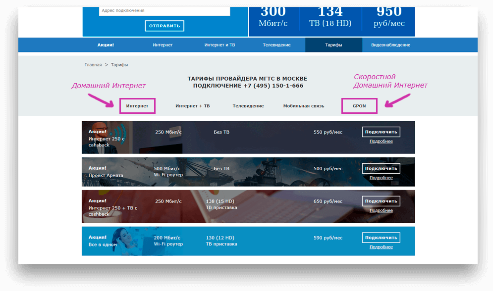 Абонентам – физическим лицам провайдер MGTS предлагает широкий спектр тарифных планов. При этом помимо уже готовых вариантов клиенты имеют возможность собрать свой собственный комплект услуг, которые они хотят получить. С подробным описанием тарифов для той или иной услуги вы можете ознакомиться, нажав на соответствующую кнопку.